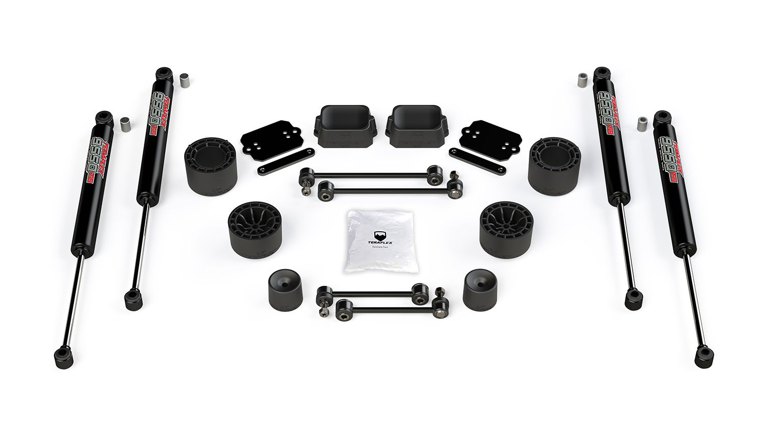 The TeraFlex JL 4dr Rubicon: 2.5? Performance Spacer Lift Kit is the most economical way to fit larger tires and increase ground clearance on your JL Wrangler Unlimited Rubicon with the fewest modifications. Also fits EcoDiesel models. The TeraFlex JL 4dr Rubicon: 2.5? Performance Spacer Lift Kit is the most economical way to fit larger tires and increase ground clearance on your JL Wrangler Unlimited Rubicon with the fewest modifications. Also fits EcoDiesel models. We recommend Falcon Performance Shocks or TeraFlex 9550 VSS Twin-Tube Shocks. These are the only shock absorbers engineered to work with TeraFlex lift coil spring spacers to improve both compression and rebound for optimal vehicle stability. The 2.5? Performance Spacer Lift Kit is offered with TeraFlex 9550 VSS Twin-Tube Shocks, with shock extensions, or without shock absorbers or extensions. Falcon Performance Shocks are available separately.